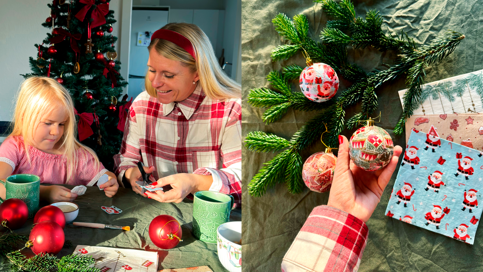- Pensl et tyndt lag af din hjemmelavede decoupagelim på julekuglen