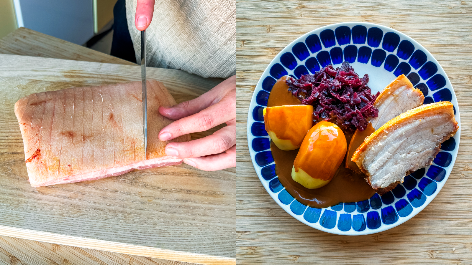 - Sørg for at sværen på flæskestegen er ridset helt ned til fedtet uden at skære i kødet