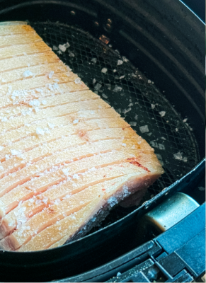 - Hæld kogende vand over stegen, så det løber ned i bunden af airfryerkurven